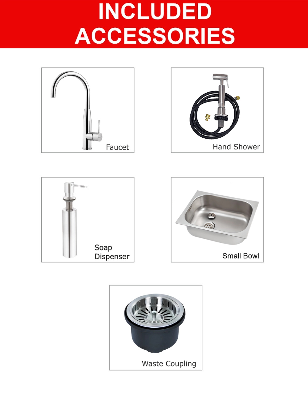 Faucet, Soap Dispenser, Hand Shower, Small Bowl, Waste Coupling