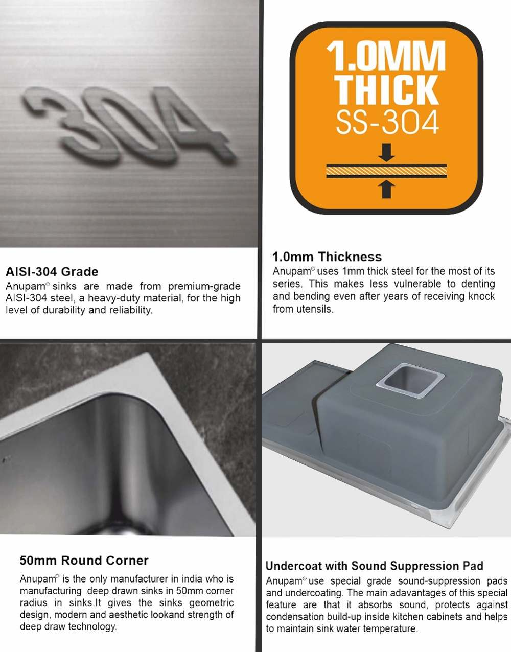 Anupam Sinks are made from the finest nickel bearing stainless steel. Manufactured using 1.0mm thick AISI-304 (18/10) Grade Stainless Steel.
