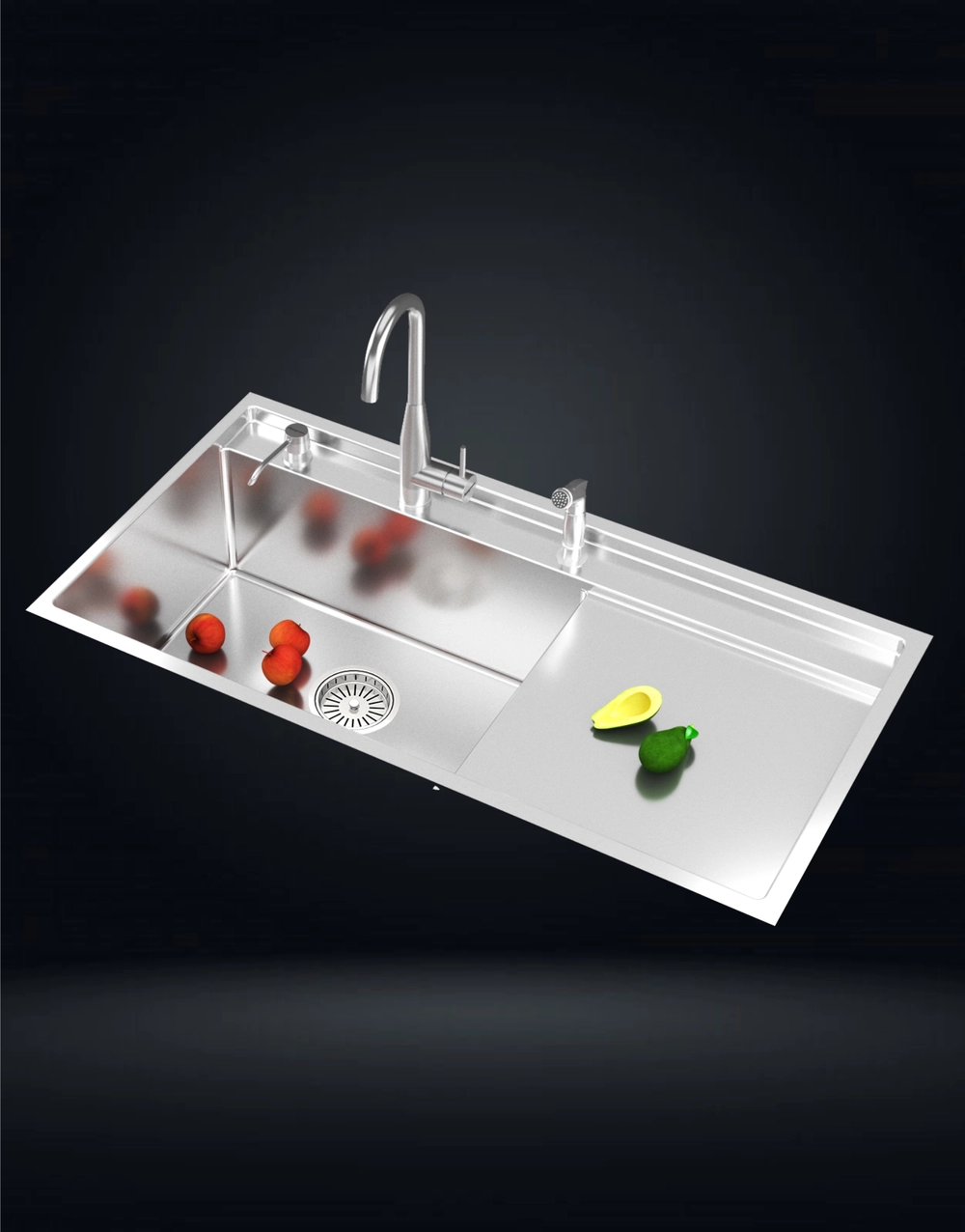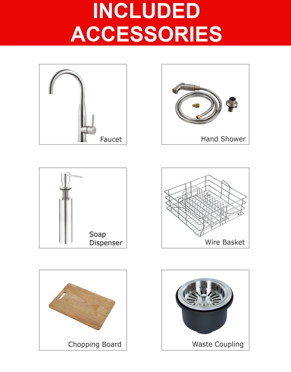 Faucet, Soap Dispenser, Wire Basket, Chopping Board, Waste Coupling