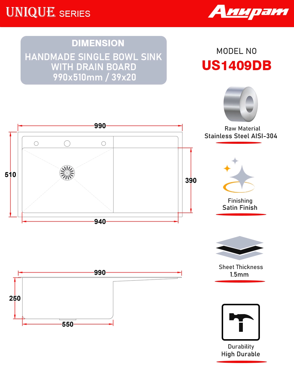 US1409DB Handmade Single Bowl Kitchen Sink with Drainboard (990 X 510mm / 39 X 20)